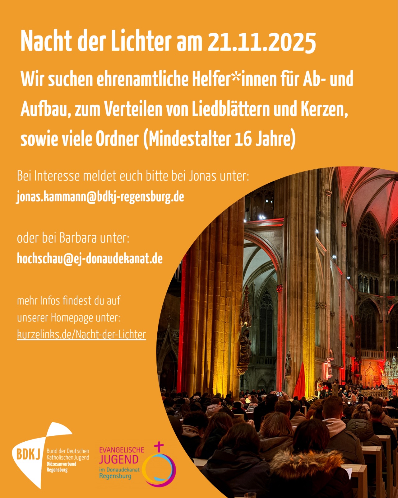 Die Evangelische Jugend im Donaudekanat Regensburg und der BDKJ Diözesanverband Regensburg laden gemeinsam zur diesjährigen »Nacht der Lichter« am Freitag, den 21. November 2025 um 19.30 Uhr in den Regensburger Dom St. Peter ein. Gemeinsam mit ca. 2.500 erwarteten Besucher:innen wollen wir den Dom mit Kerzenschein zum Leuchten und die alten Gemäuer mit Taizé-Liedern zum Klingen bringen. Das Kerngebet dauert ca. eine Stunde, dann beginnt das Gebet vor dem Kreuz und es wird noch gemeinsam weitergesungen. Dieser Abend ist nicht nur für Jugend- oder Konfigruppen ein besonderes Highlight, das man einfach erleben muss!